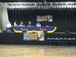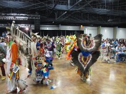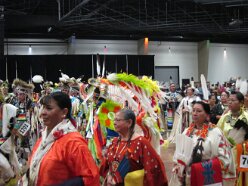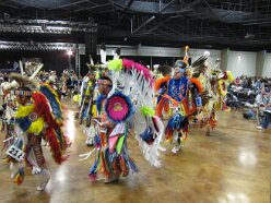 While visiting family in Durant, OK we took the opportunity to attend the Choctaw 6th Annual Pow Wow being held at the Event Center of the Choctaw Casino Resort. A colorful (and noisy) event, the Pow Wow is a festival & celebration in which members of the Choctaw Tribe come from throughout the U.S. and Canada to show off their native dress, dancing abilities, and playing native instruments. All in all, a very impressive show. Standing at the entrance to the Event Center are Marian, Betty, and Kaye.