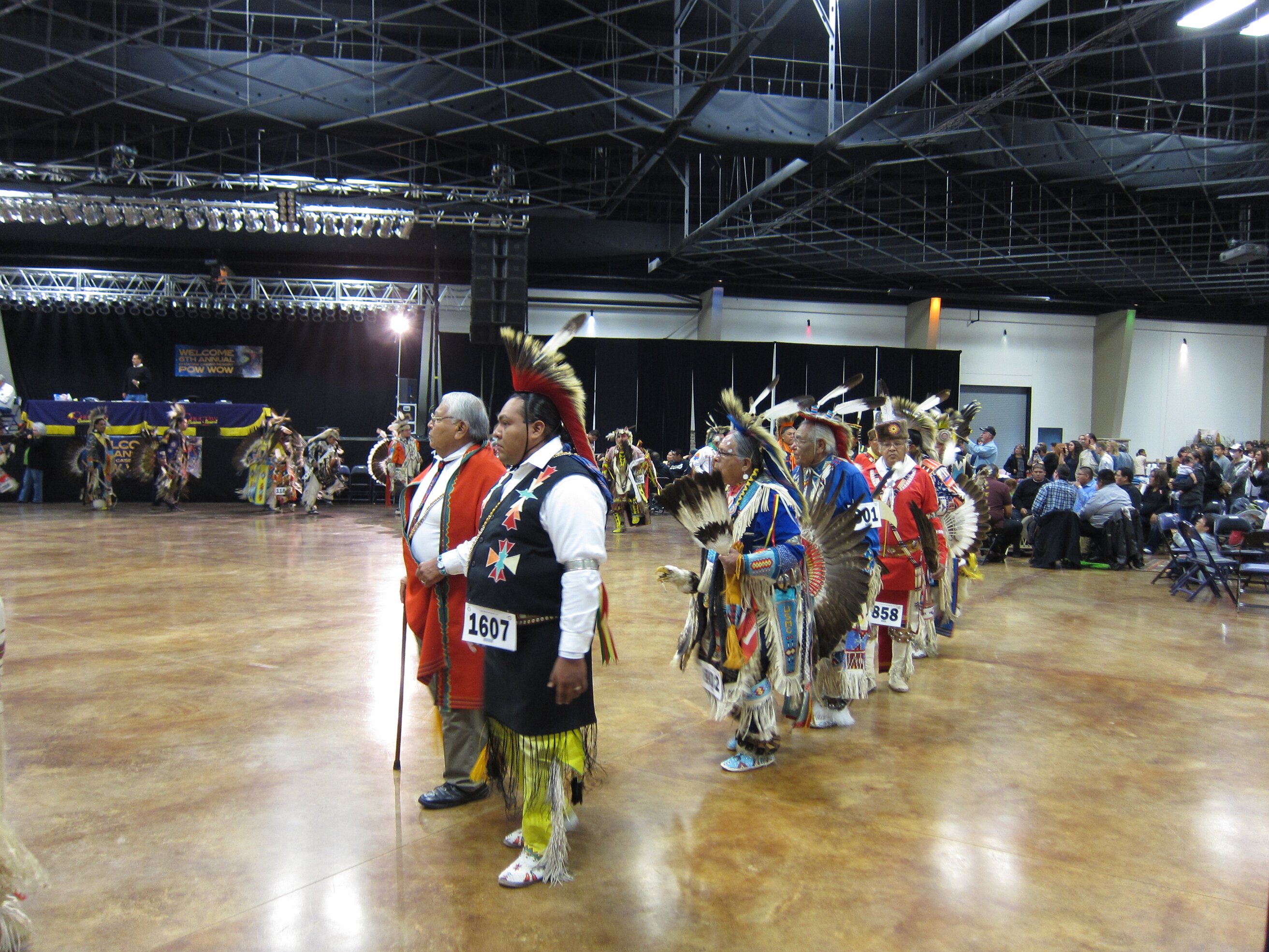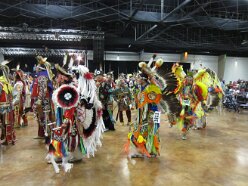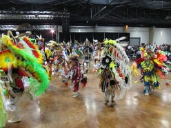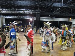While visiting family in Durant, OK we took the opportunity to attend the Choctaw 6th Annual Pow Wow being held at the Event Center of the Choctaw Casino Resort. A colorful (and noisy) event, the Pow Wow is a festival & celebration in which members of the Choctaw Tribe come from throughout the U.S. and Canada to show off their native dress, dancing abilities, and playing native instruments. All in all, a very impressive show. Standing at the entrance to the Event Center are Marian, Betty, and Kaye.