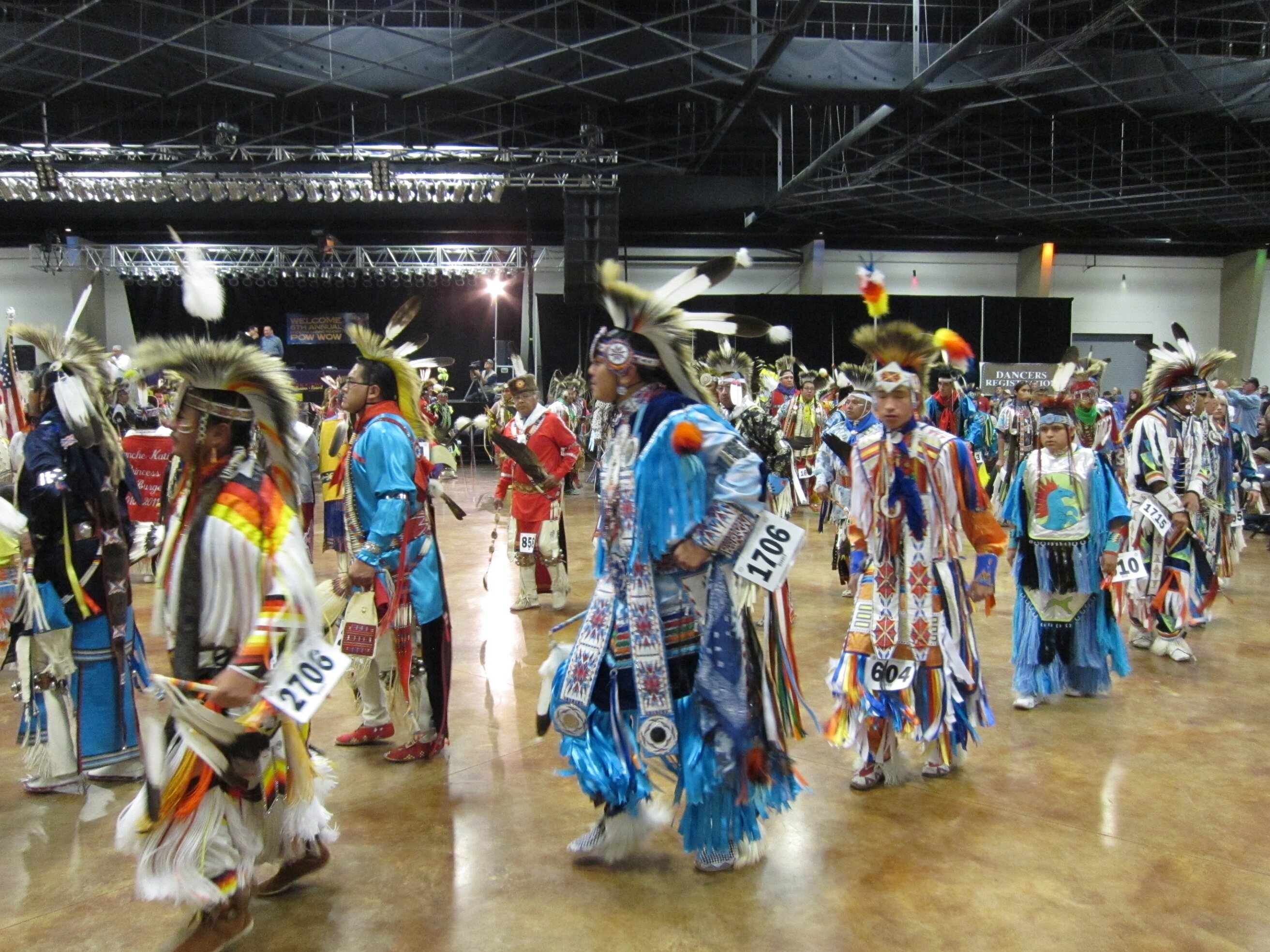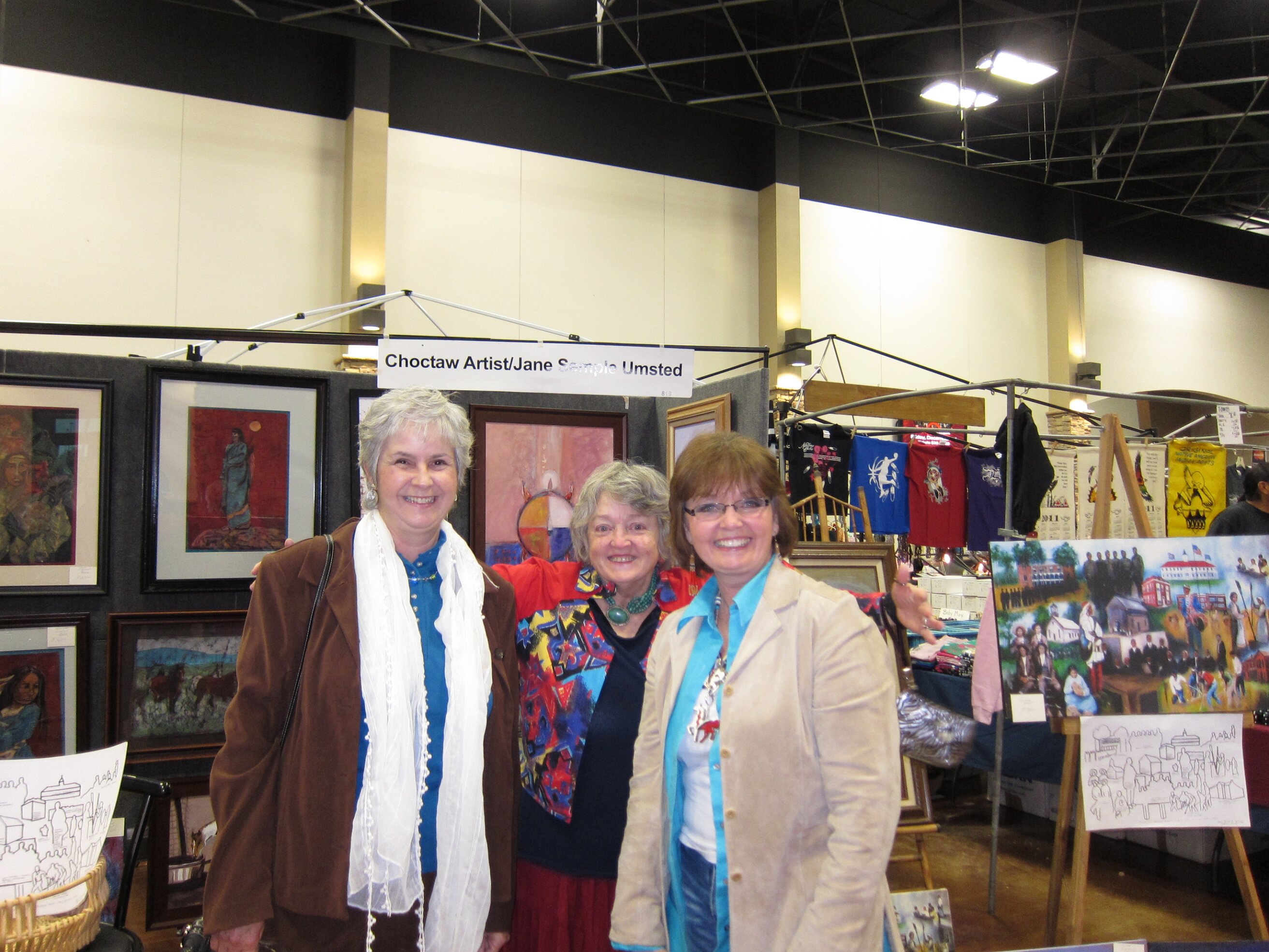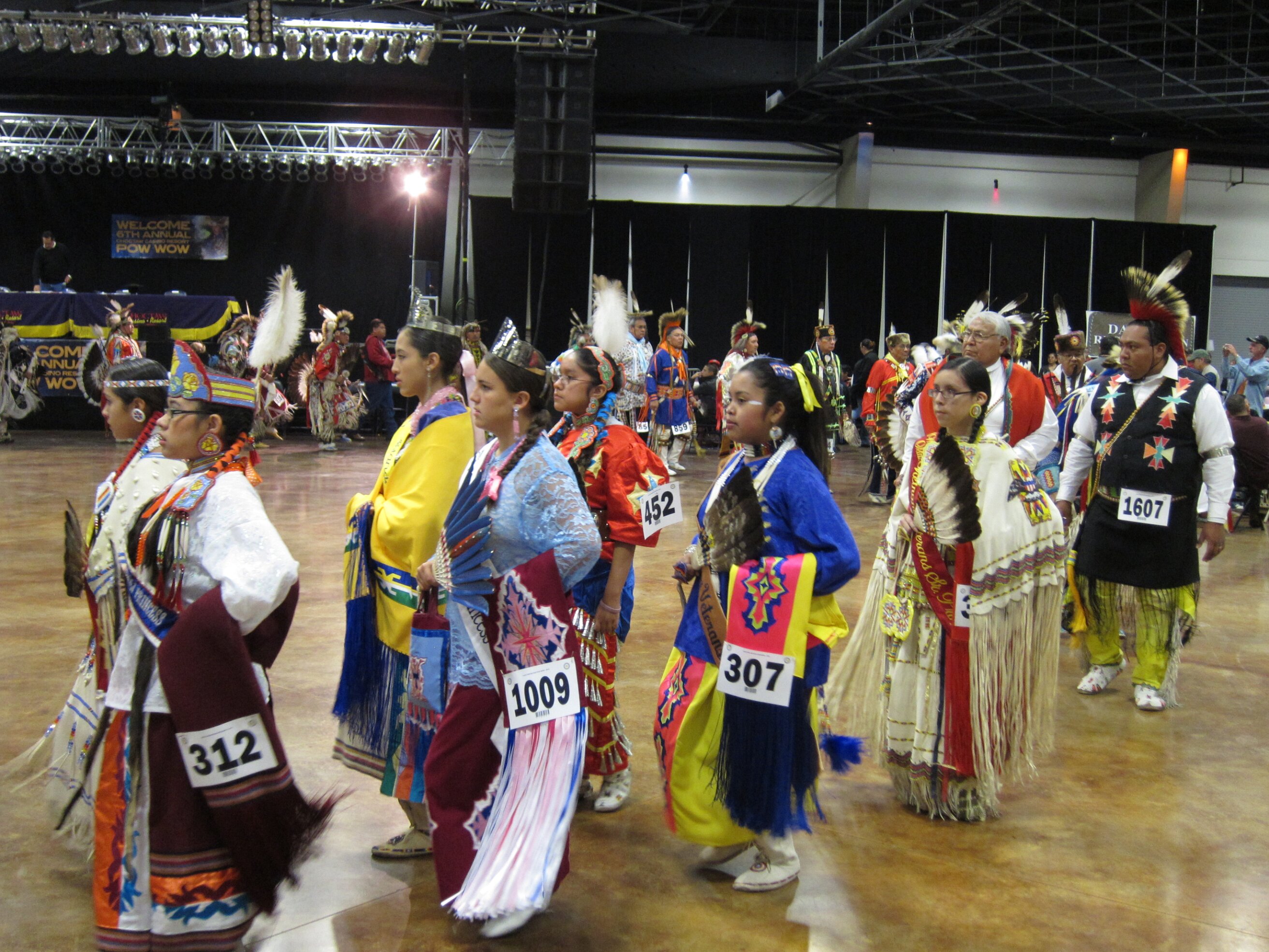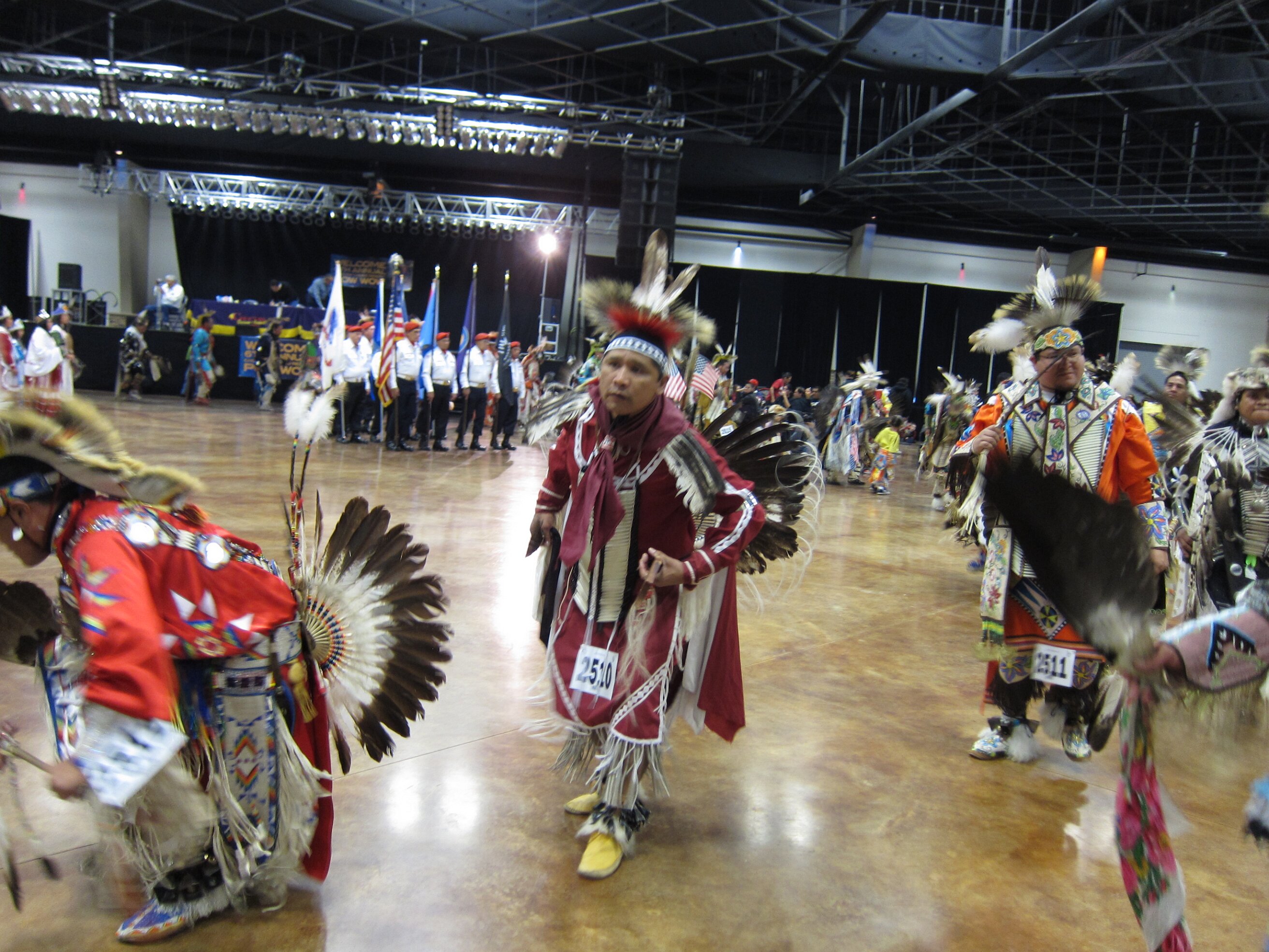 While visiting family in Durant, OK we took the opportunity to attend the Choctaw 6th Annual Pow Wow being held at the Event Center of the Choctaw Casino Resort. A colorful (and noisy) event, the Pow Wow is a festival & celebration in which members of the Choctaw Tribe come from throughout the U.S. and Canada to show off their native dress, dancing abilities, and playing native instruments. All in all, a very impressive show. Standing at the entrance to the Event Center are Marian, Betty, and Kaye.