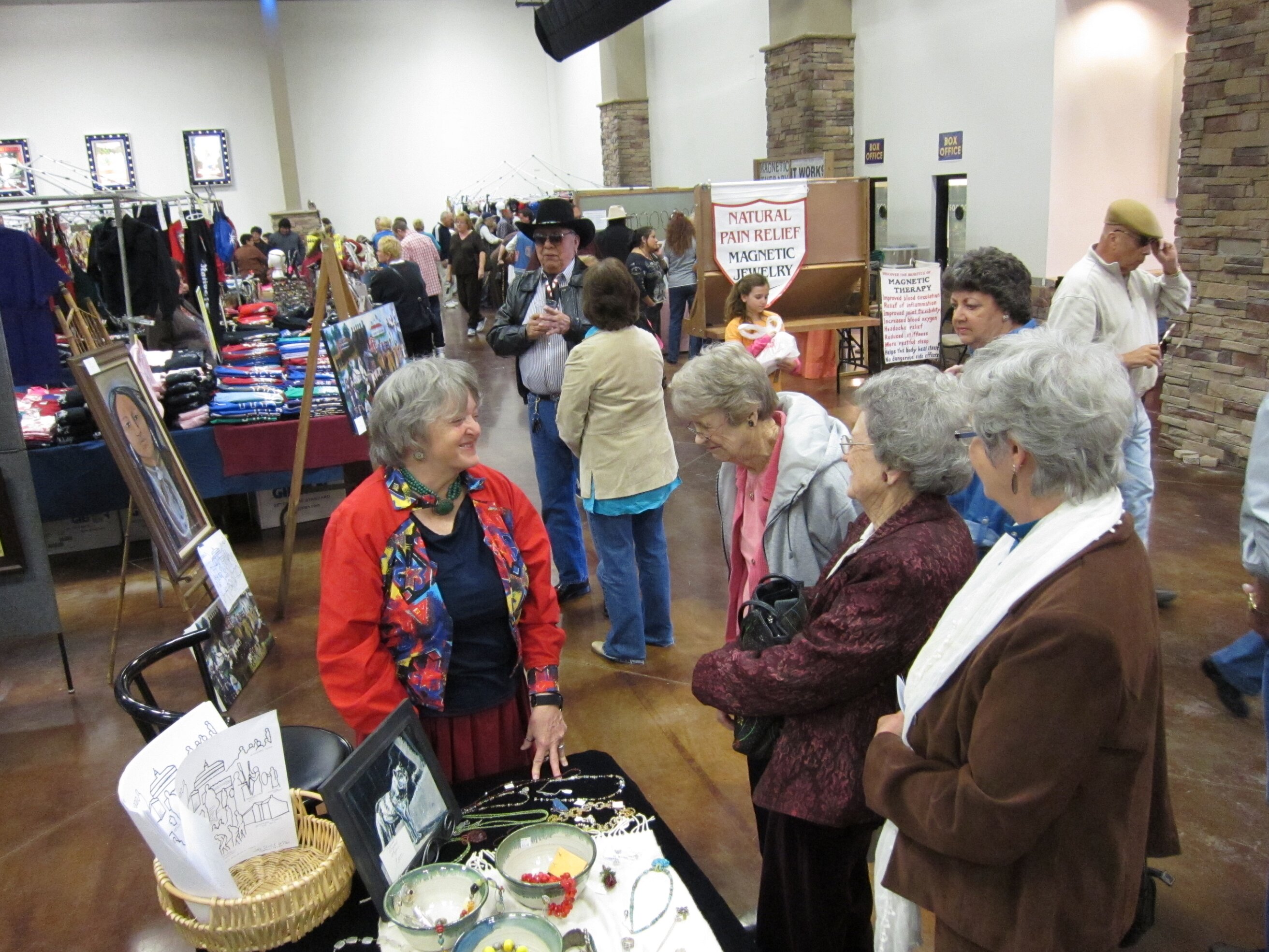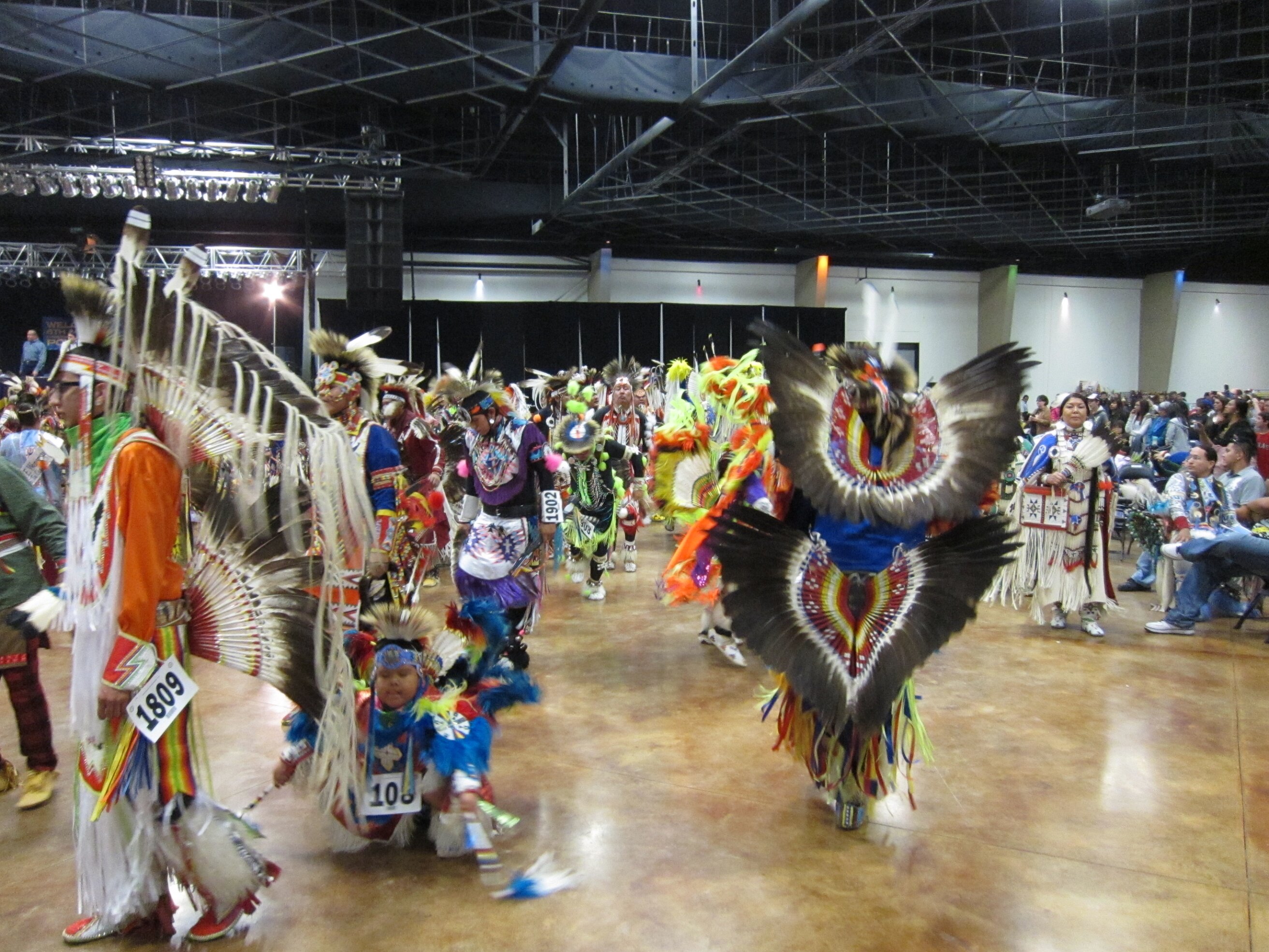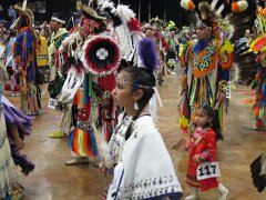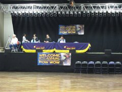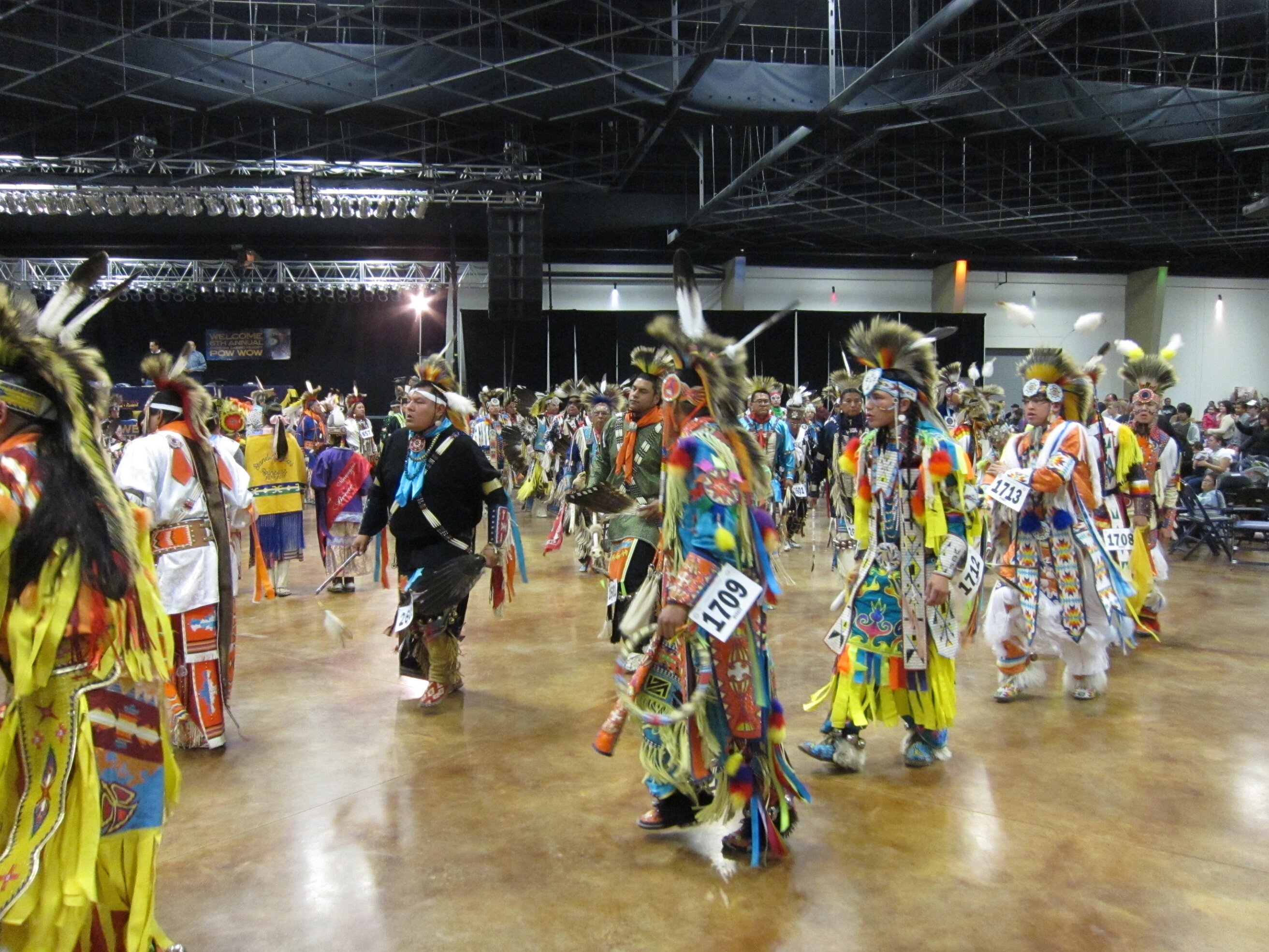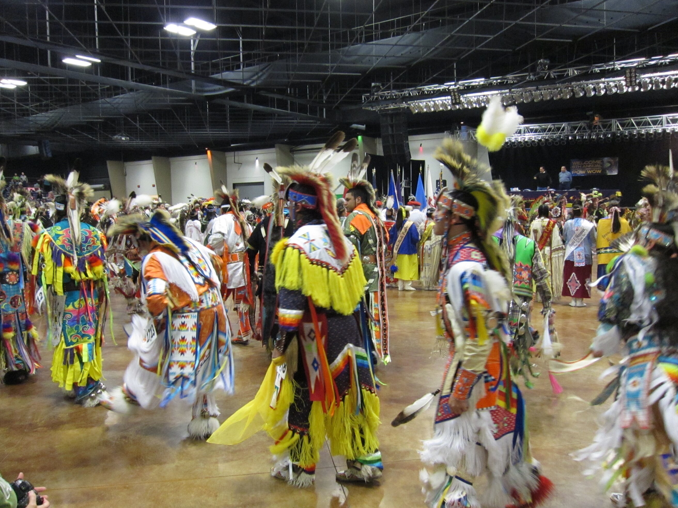 While visiting family in Durant, OK we took the opportunity to attend the Choctaw 6th Annual Pow Wow being held at the Event Center of the Choctaw Casino Resort. A colorful (and noisy) event, the Pow Wow is a festival & celebration in which members of the Choctaw Tribe come from throughout the U.S. and Canada to show off their native dress, dancing abilities, and playing native instruments. All in all, a very impressive show. Standing at the entrance to the Event Center are Marian, Betty, and Kaye.